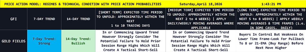 KEY TAKEAWAY: 🟡 WAIT FOR PULLBACK / 🔴 SHORT ON FAILURE | Gold Fields is pushing higher in a structurally bullish regime, but is running into heavy overhead resistance with stretched near-term momentum; traders should strongly consider a tactical short-sell if the price fails at these highs, or wait for a pullback to the moving averages to safely accumulate structural longs.