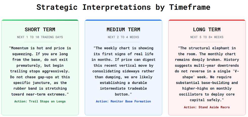 Three (3) ‘trading’ time frames are considered: Short Term (1 to 10 days) / Medium Term (2 to 4 weeks) and Long Term (5 to 8 weeks)